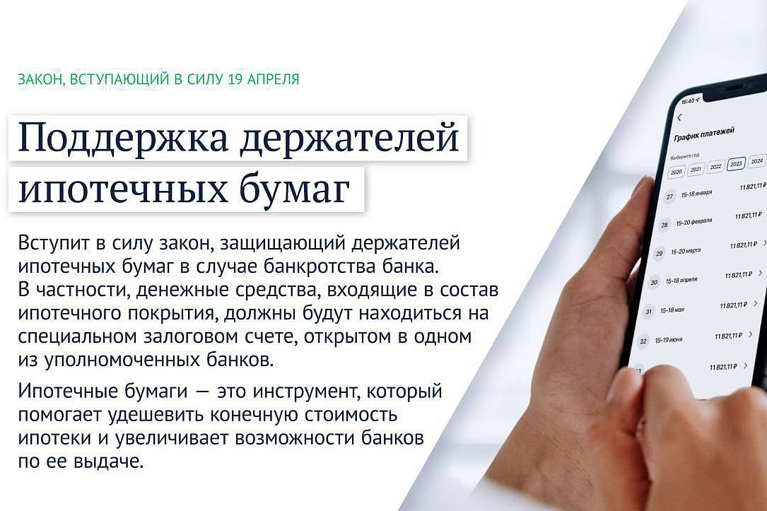 Кроме того, вступит в силу закон, защищающий держателей ипотечных бумаг в случае банкротства банка.