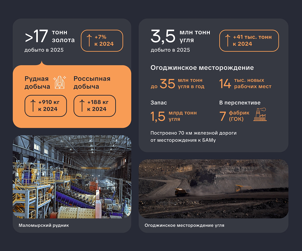 Золотодобывающие предприятия региона в этом году обеспечат общую добычу более 17 тонн драгоценного металла. Вклад внесли как крупные рудники, так и добытчики россыпного золота, среди которых лидерами сезона стали группа компаний «Атлас Майнинг» и «Прииск Соловьёвский». На следующий год поставлена задача выйти на отметку в 20 тонн. Значительный рост показала и угольная промышленность. По предварительным данным, годовой объем добычи превысит 3,5 миллиона тонн. Этот рывок стал возможен благодаря активной разработке Огоджинского месторождения в Селемджинском районе, включённого в федеральную программу развития угольной отрасли до 2030 года.