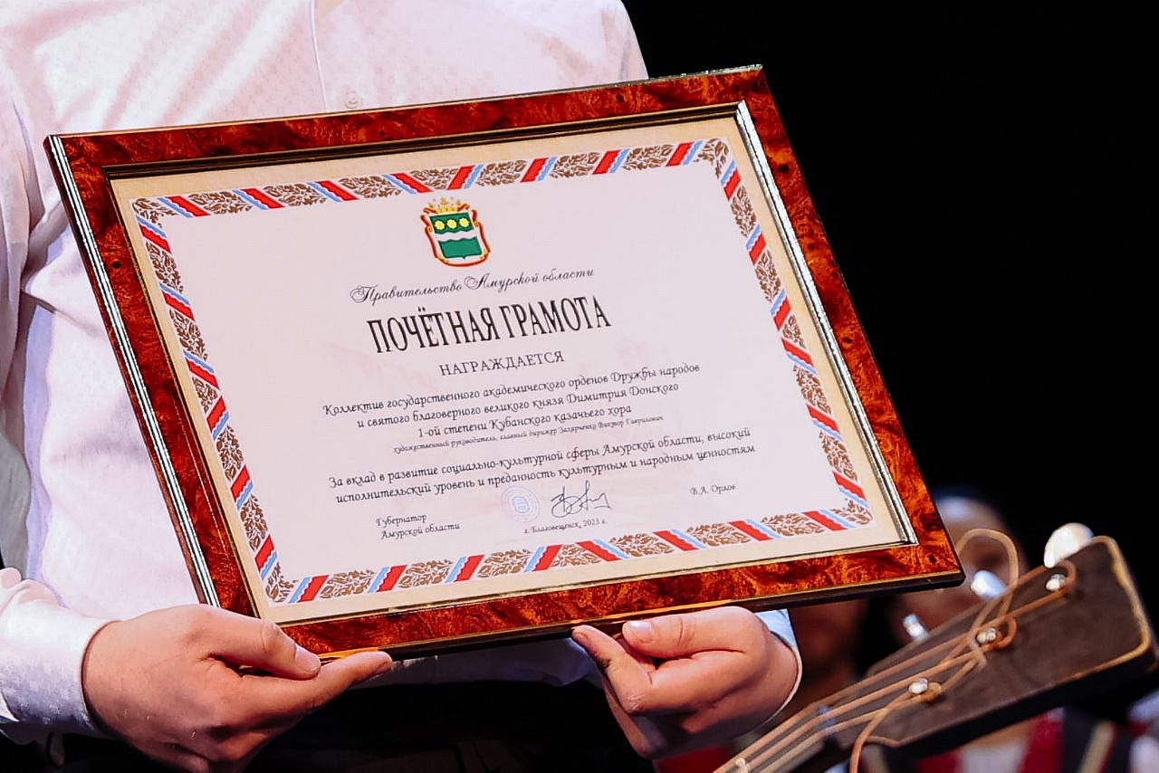 Губернатор Амурской области Василий Орлов наградил почётной грамотой Кубанский казачий хор. Руководитель региона вместе с семьёй побывал на концерте коллектива из Краснодарского края, который приехал в Благовещенск на гастроли.