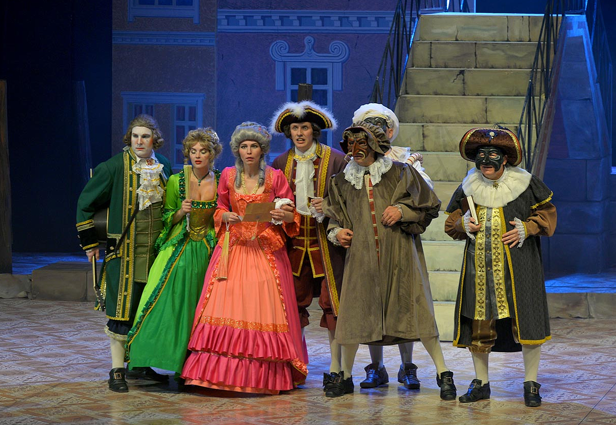 Амурский областной театр драмы представляет на суд зрителя знаменитую историю о ловком слуге Труффальдино из Бергамо, который ради большего барыша работает сразу на двух господ и прикладывает все усилия, чтобы они не встретились. Шутка ли – за такую выходку бедного проныру могут знатно поколотить. Что вполне в духе комедии дель арте, под которую и стилизована постановка – весьма тонко над этим поработал московский режиссер-постановщик Михаил Лукин. Но не стоит переживать за Труффальдино – этот хитрец выпутается, кажется, из самого сомнительного положения! Комедия со стремительно меняющимися событиями обязательно порадует публику классическим и вечным сюжетом. Историю о пронырливом слуге, около трехсот лет назад написал знаменитый итальянский драматург и писатель Карло Гольдони. И по-прежнему она актуальна и не сходит с мировых подмостков. Объемная, фактурная сценография без труда поможет зрителю перенестись в солнечную Италию. И тут – не обойдется без сюрпризов! Спектакль «Слуга двух господ» рассказывает о том, что каждый человек может стать счастливым и подарить счастье другому. А маленькая хитрость или вынужденный обман - вовсе не преступление, если совершается исключительно в благих целях и в конце приводит к радостному финалу.