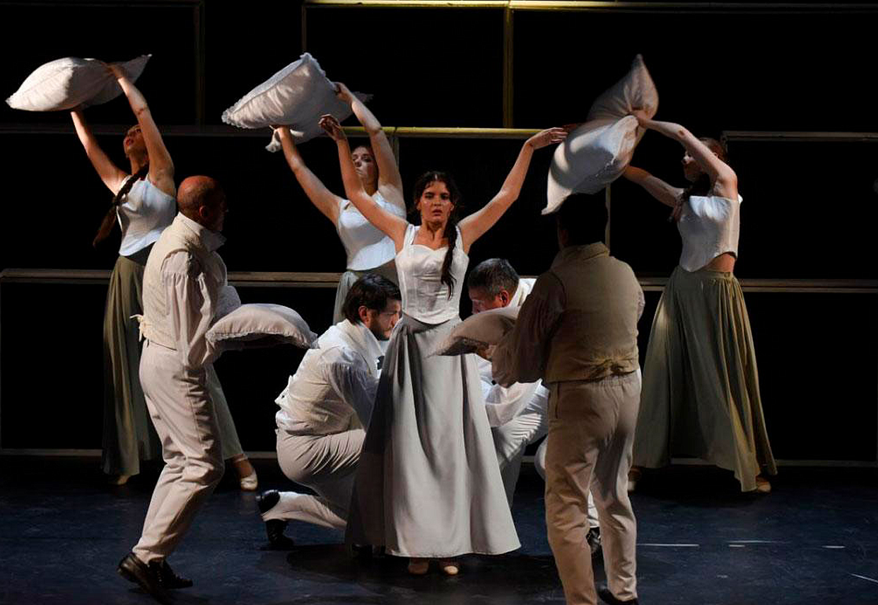 «Евгений Онегин» - самый масштабный спектакль Амурского театра драмы и, пожалуй, самый яркий на сегодняшний день - зритель сможет насладиться нарядами онегинской эпохи: цветастыми сарафанами, черно-белыми классическими формами, элегантными вечерними платьями дам а ля «бордо» и мужскими фраками. Очень выразительны декорации в несколько ярусов. В одной сцене они превращаются в деревенский дом Лариных, в другой – в место дуэли Онегина и Ленского, в третьей – в сверкающий бальный зал княжны Алины. На огромном заднике, то и дело появляющемся на авансцене, проекция периодически выводит знаменитые пушкинские строфы, подводя зрителей к очередной главе романа. В спектакле звучат романсы, исполняемые под звуки аккордеона.