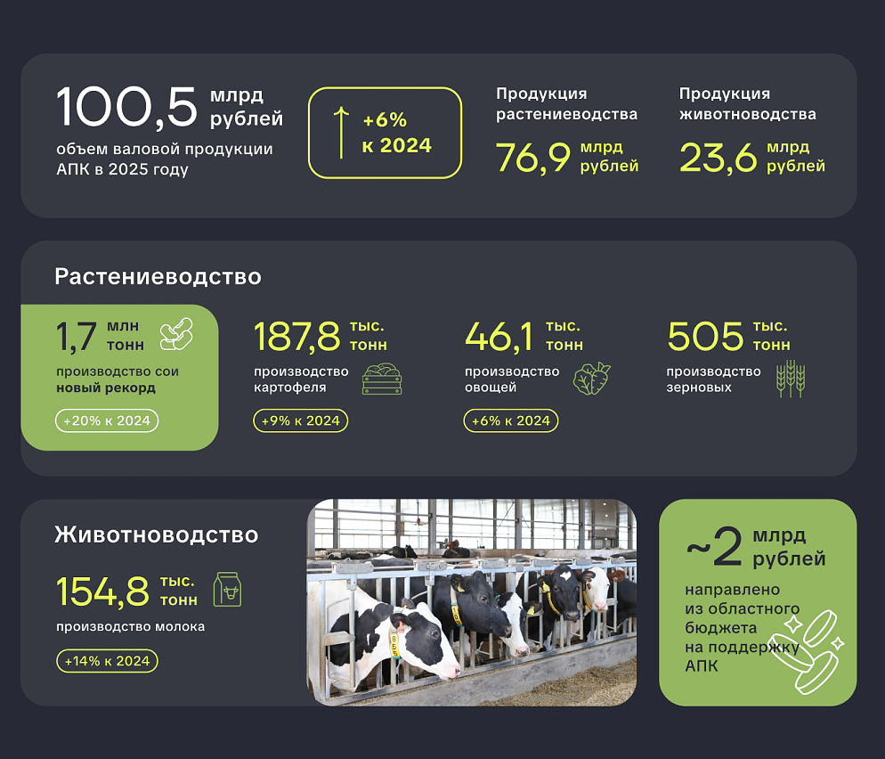 Также в регионе наблюдается положительная динамика в животноводстве: производство молока по итогам года составит 155 тысяч тонн. В планах — реализация крупных проектов в Тамбовском и Ивановском округах, которые увеличат объёмы производства ещё на 20 тысяч тонн. Господдержка агропромышленного комплекса в текущем году составит 2 миллиарда рублей. При этом губернатор заявил, что помимо финансовой помощи, отрасль нуждается в технологическом перевооружении. В числе приоритетов — внедрение искусственного интеллекта, беспилотных технологий и газификация транспорта.