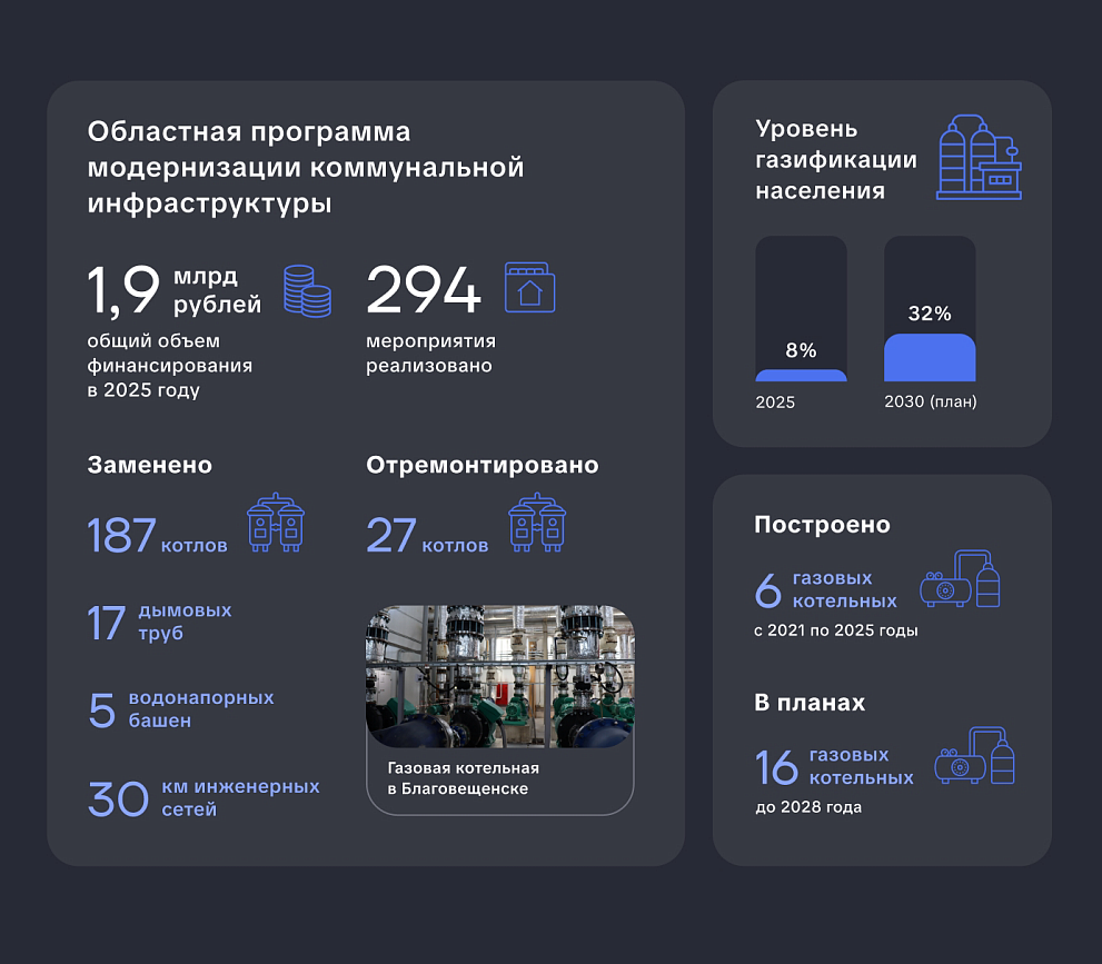 Важной частью работы является строительство газовых котельных. За последние четыре года ввели в эксплуатацию шесть таких объектов. Например, в прошлом году в Благовещенске запустили котельную для обеспечения теплом крупного Северного микрорайона, где в перспективе будут жить 17 тысяч человек. Планы по развитию территории включают строительство школы с бассейном, детского сада, поликлиники и торговых центров. До 2028 года в собираются возвести ещё 16 газовых котельных в Благовещенске, Тынде, Свободном, Чигирях и посёлке Аэропорт. Эти объекты важны для поддержания темпов жилищного строительства в областном центре. Также в перспективе рассматривается возможность перевода на газ Благовещенской ТЭЦ.