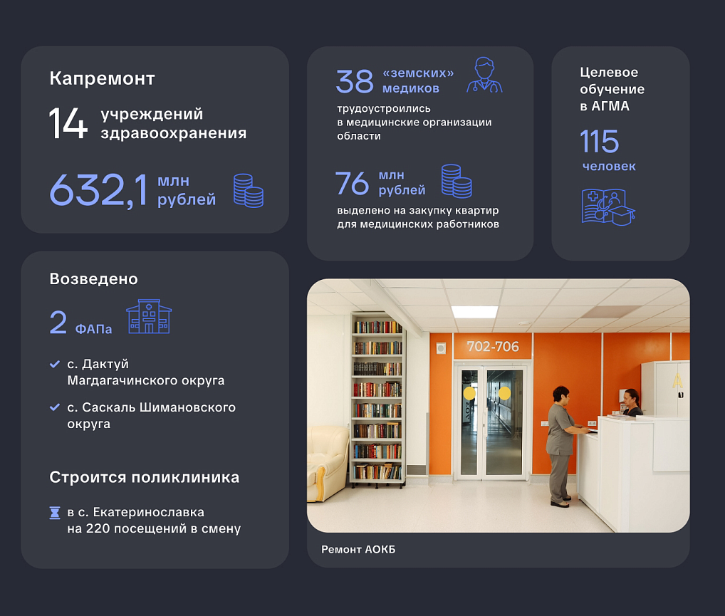 Эта сумма на 13 миллиардов превышает показатели прошлого года. Об этом сообщил губернатор Василий Орлов во время своего выступления с ежегодным отчётом. Значительные средства инвестируются в модернизацию медицинской инфраструктуры. В 14 учреждениях области проходит капитальный ремонт. Из областного бюджета на эти цели выделили 630 миллионов рублей. Параллельно с ремонтными работами идёт оснащение больниц и поликлиник новой мебелью и современным оборудованием. Продолжается обновление Амурской областной клинической больницы, который проводится поэтажно.